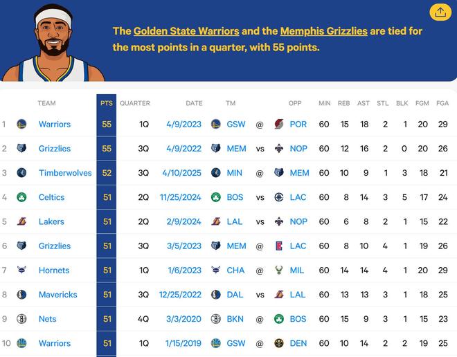 在2023年4月9日,勇士在客戰(zhàn)開拓者的首節(jié)比賽中拿到了55分;在2022年4月9日,灰熊在主場(chǎng)對(duì)陣鵜鶘的比賽中的第三節(jié)拿到了55分。